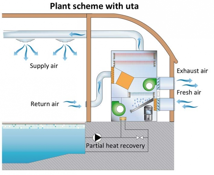 The energy recovery high efficiency dehumidifiers UTA range have been designed to grant the complete control of temperature, humidity, the energy recovery and the fresh air treatment in the covered swimming pools or in other applications with very high internal loads.